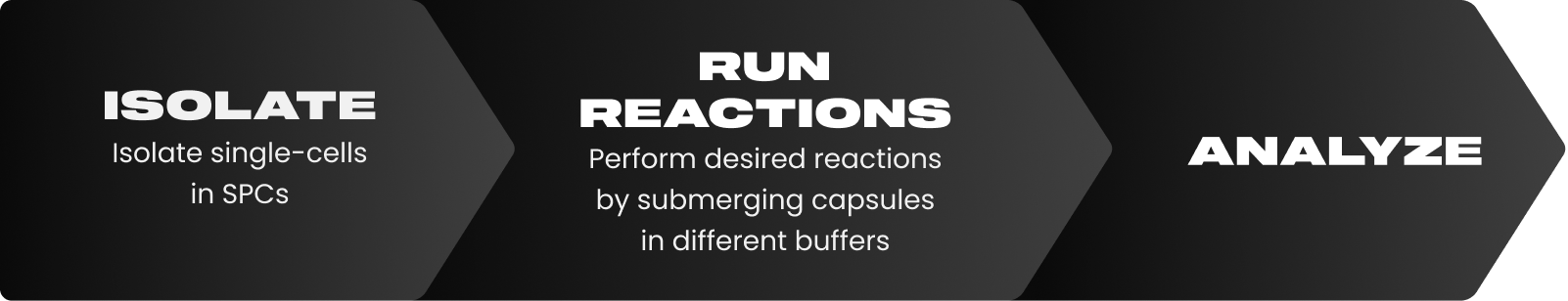 Semi-Permeable Capsules (SPCs) are versatile microreactors that isolate cells and maintain their compartmentalization during bulk reactions. Their robustness and permeability enable seamless single-cell assay customization through simple buffer exchanges.