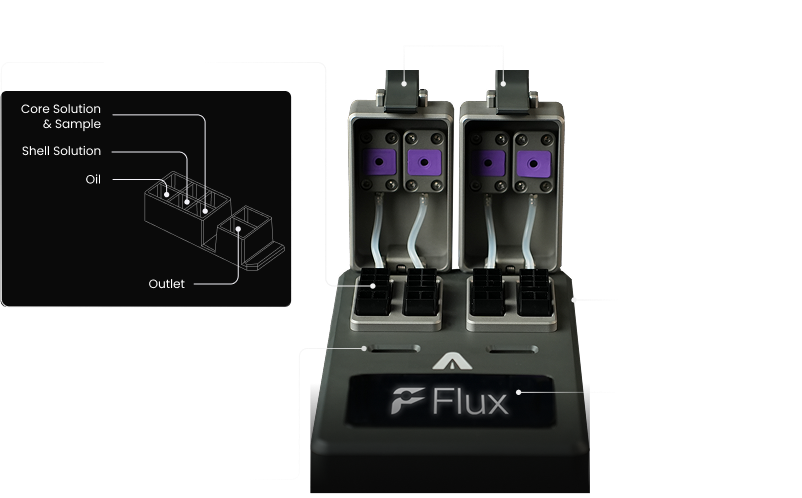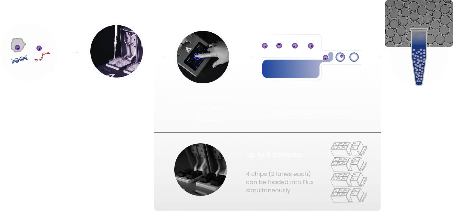 Flux makes single-cell isolation effortless. With the press of a button, it encapsulates 100,000s of single cells into Semi-Permeable Capsules (SPCs) in just 30 minutes. Designed for efficiency, Flux processes up to 8 samples simultaneously and integrates seamlessly with Atrandi’s reagent kits for downstream applications.